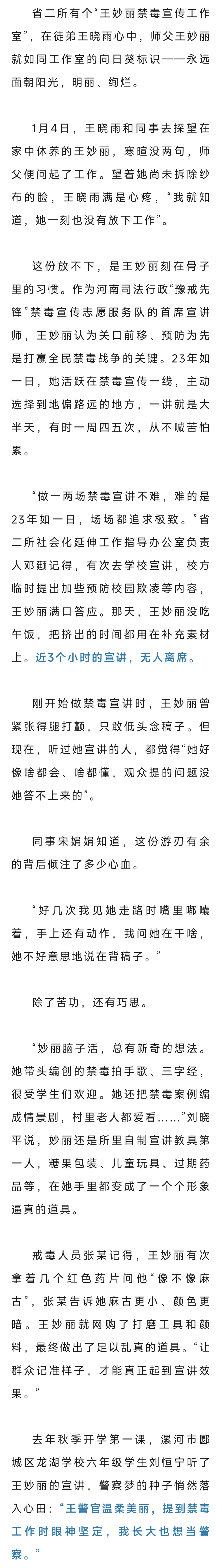 事迹传回母校河南司法警官职业学院,当年的辅导员刘鹏启既担心又骄傲,“假期,便装,还带着孩子,她就算没站出来,谁还能说些什么?可她呢,还是学生时代那个王妙丽”。