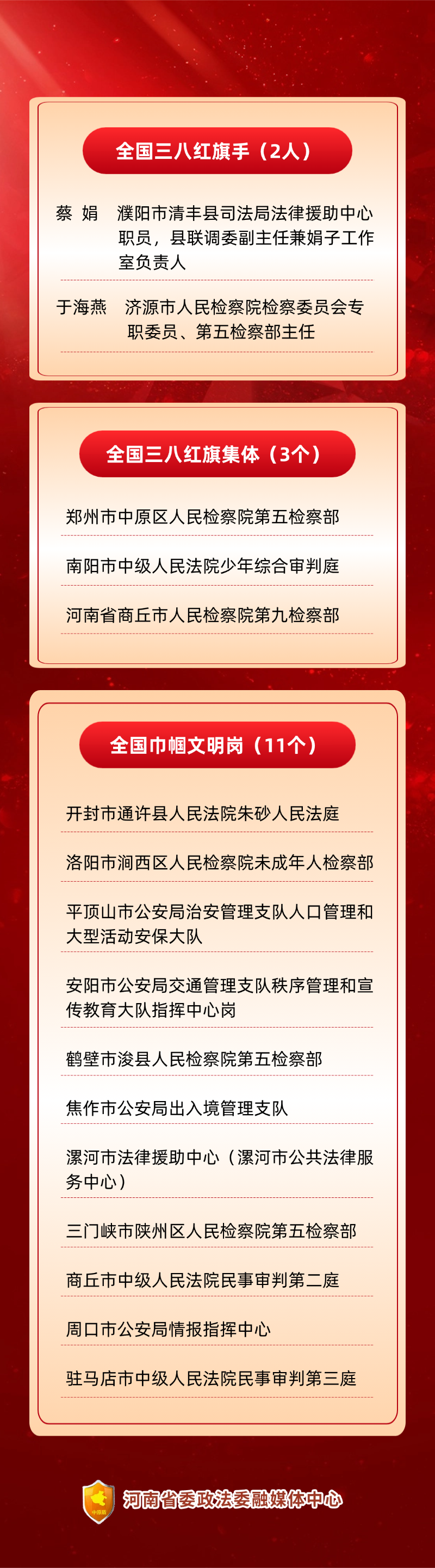 为表彰先进、树立榜样,充分发挥先进典型和模范人物示范作用,全国妇联决定,授予兰臻等9人全国三八红旗手标兵称号,授予阮祥燕等598人全国三八红旗手称号,授予中国人民抗日战争纪念馆社会教育部等400个单位全国三八红旗集体称号,授予首都医科大学附属北京同仁医院耳鼻咽喉头颈外科等600个单位全国巾帼文明岗称号。