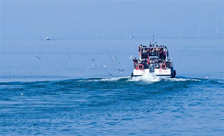 在淅川县宋岗码头,鸥鸟翩跹,游客们乐享生态美景。该区域位于国家一级水源保护区外,已成为“中原看海”的知名打卡地。崔培林摄