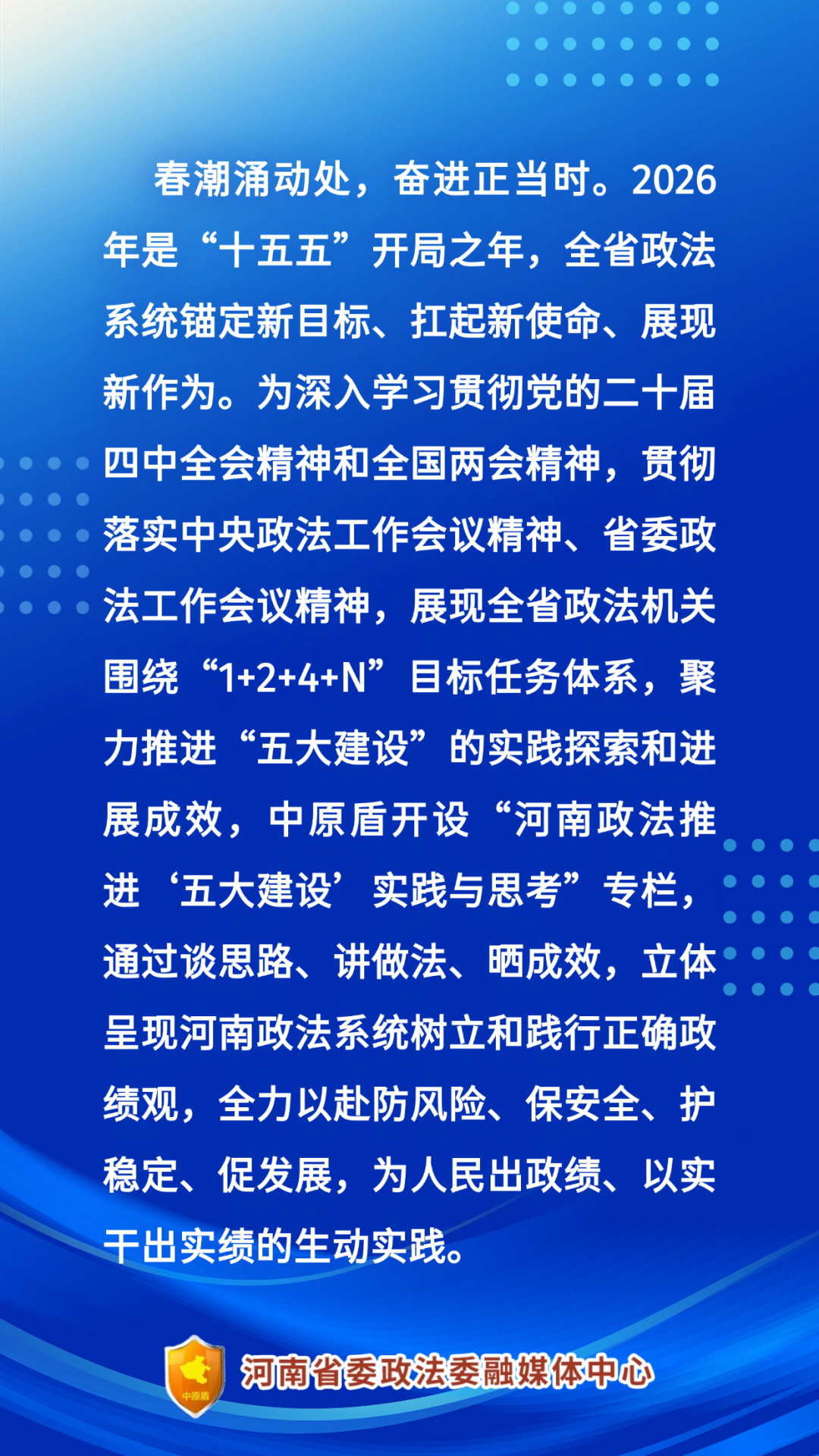 2026年,全省法院将严格落实省委部署要求,坚持“夯实基、务实功、出实绩”工作主线,通过夯基铸魂,以信念坚定筑牢绝对忠诚根基;夯基提质,以理念重塑促推办案质效跃升、群众满意度提升;夯基赋能,以素能提升锻造过硬法院队伍;夯基进阶,以品牌创建绘就工作崭新图景。一步一个脚印,踏踏实实干好工作,更好发挥司法惩罚犯罪、保护人民,定分止争、维护公正职能作用,努力为平安河南法治河南建设提供更高水平的司法服务和保障。
