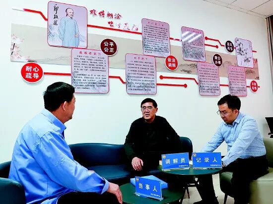 △濮阳市范县综治中心“板桥调解室”调解员正在调处一起邻里纠纷。