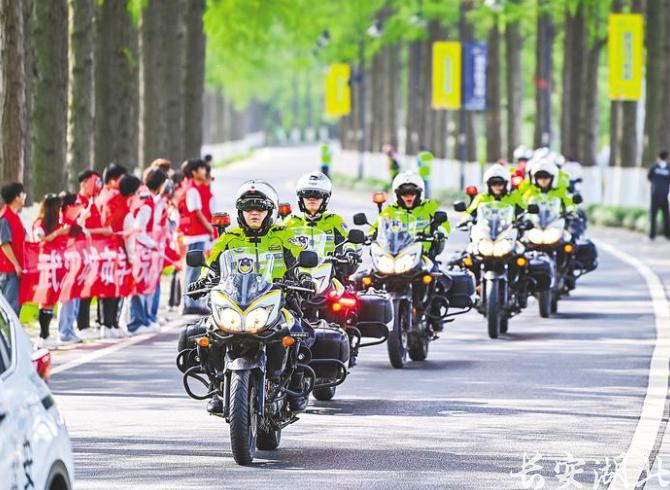 警用摩托车为汉马运动员开道,成为东湖绿道亮丽的“警”色