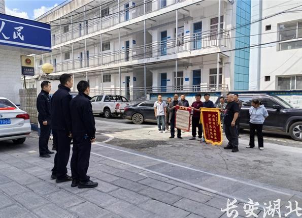 湖北长阳土家族自治县贺家坪镇的村民代表们将锦旗送到贺家坪派出所民警手中
