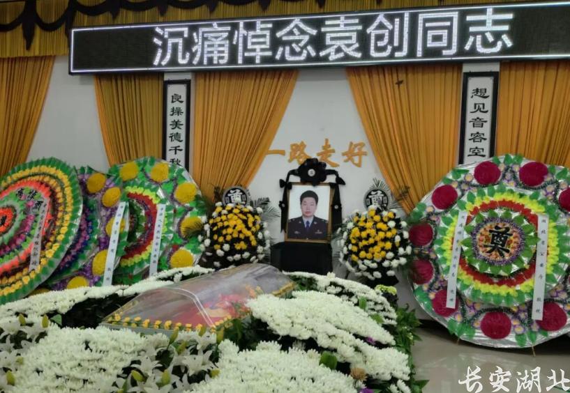 11月1日8时,湖北省英山县殡仪馆内庄严肃穆,哀乐低回,英山县公安局金家铺派出所所长袁创的遗体告别仪式在这里举行。近500名袁创生前的同事、同学、亲朋以及闻讯赶来的群众前来为他送行。