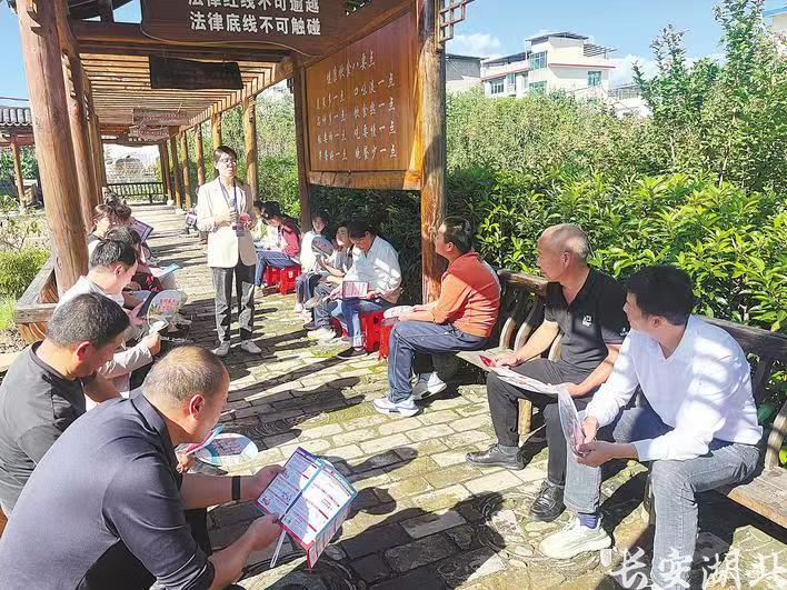 在荆州市洪湖市螺山镇中原村的议法长廊里,“法律明白人”胡浩正和几位村民围坐一圈,一边用方言解读法律条文,一边讲述湘鄂西苏区时期保障农民权益的红色故事。如今,这样融合红色基因与法治精神的“板凳普法会”,已成为洪湖市乡村里一道独特的法治风景线。