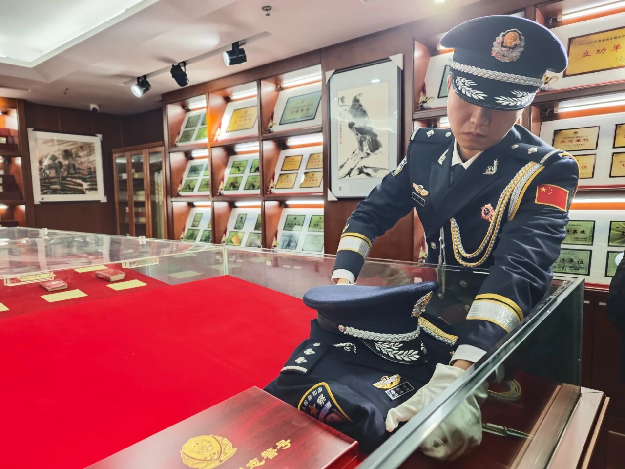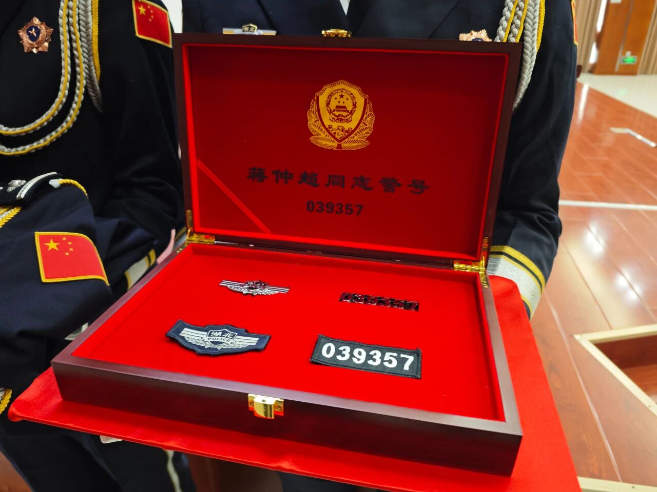 分局政委李国祥对警号和警服进行仔细整理,随后将装有“039357”警号的礼盒盒盖盖好。