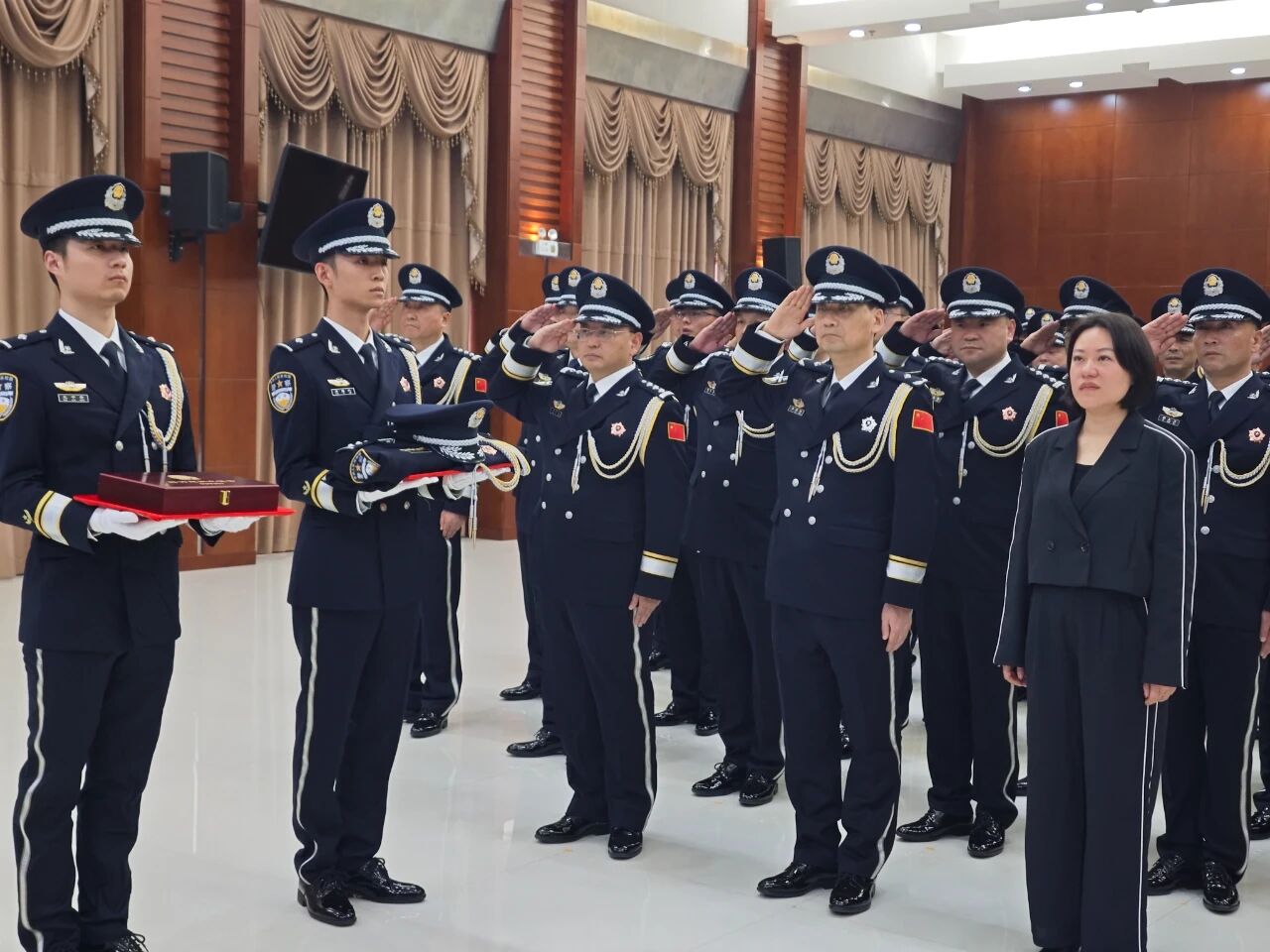“敬礼!”伴随着雄壮的《中国人民警察警歌》,全体人员举起右手致敬,目送昔日战友的警号被移送至分局警史馆。