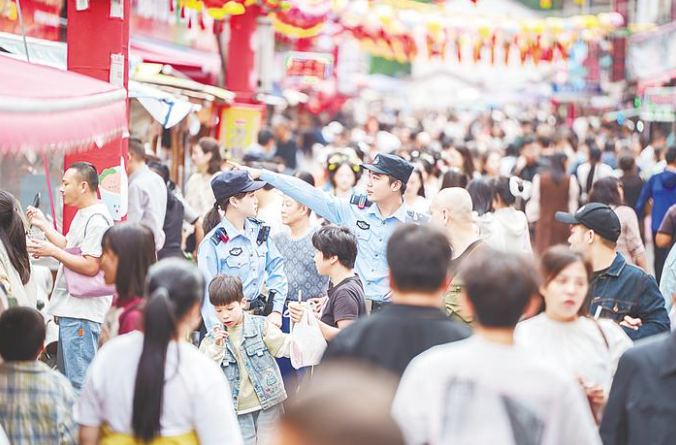 国庆期间,荆州市公安局沙市区分局民警在大赛巷小吃街巡逻。(湖北日报通讯员关小羽摄)