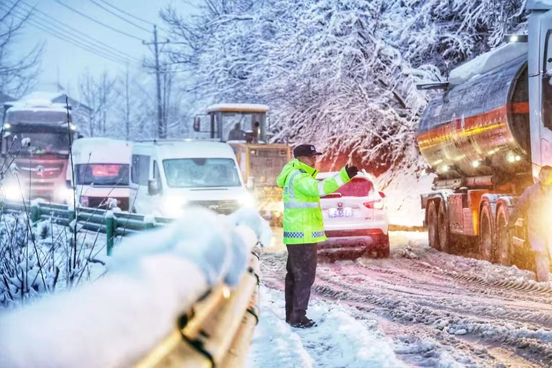 ▲宜昌交警在积雪路段排堵保畅