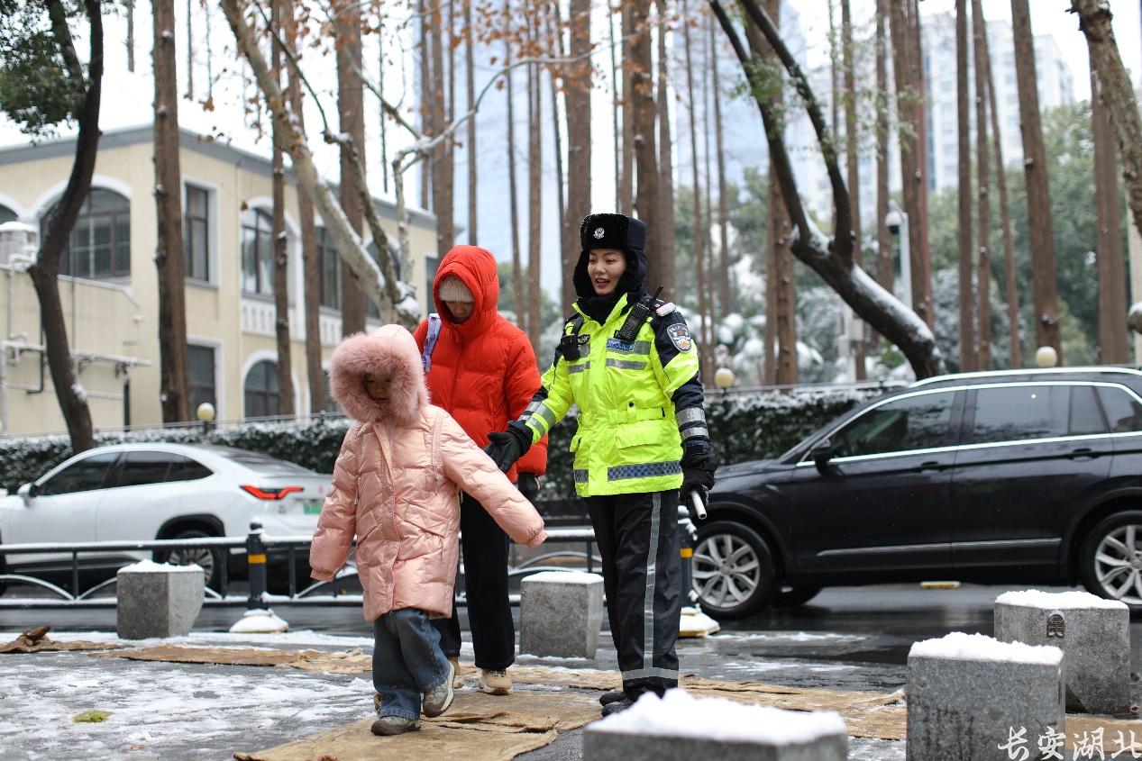 同一时间,一元路小学门口,交警江雅莉蹲身牵起怯于过马路的小女孩,在积雪中走出两串温暖的脚印;沿江大道三阳路口,民警黄念悉心搀扶拄拐老人安全过街,用行动诠释“民有所需、警有所应”。