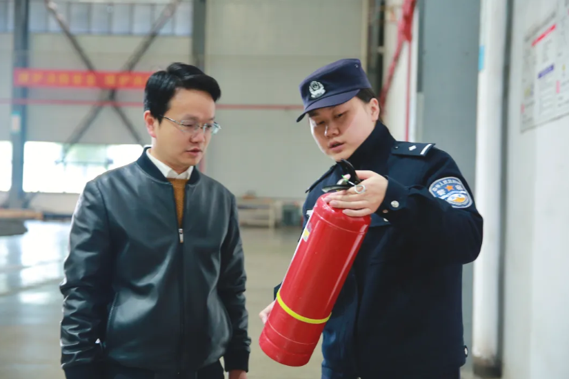 ▲黄石市公安局开发区·铁山区分局民警走进企业检查消防器材
