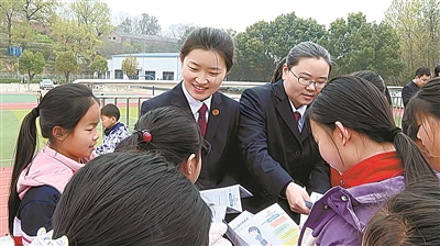 2026年3月,湖北省随州市检察院未检干警熊春琳(右二)与广水市检察院未检干警共同开展“法治进校园”活动。