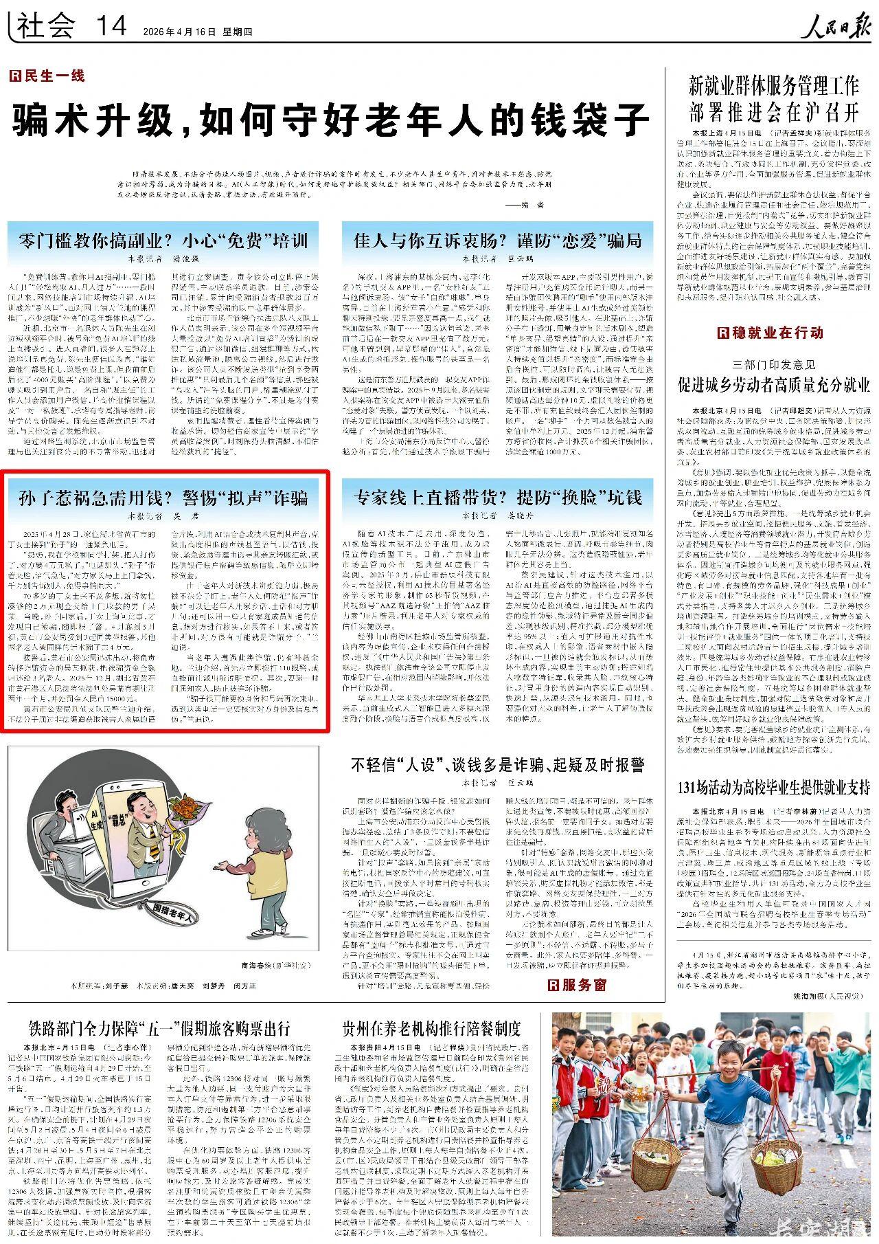 4月16日,《人民日报》14版刊登《骗术升级,如何守好老年人的钱袋子孙子惹祸急需用钱?警惕“拟声”诈骗》,以下为文章全文。
