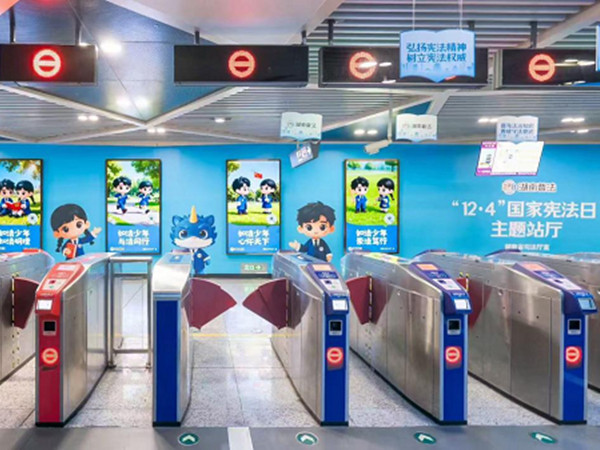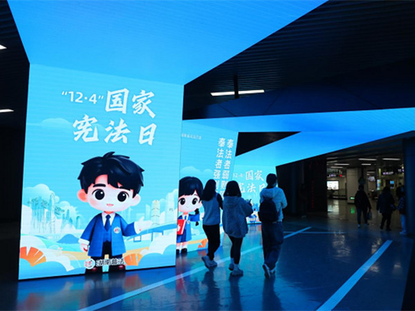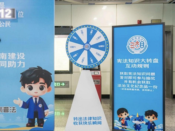 值得关注的是,长沙地铁数字艺术馆打造了主题宣传空间,以“司法蓝”为主色调,运用LED大屏和AI等前沿技术,将“如法少年”动态形象与“湖南普法”新logo动画相结合,通过沉浸式场景营造,让群众在直观感受品牌魅力的同时,深度领悟宪法精神,成为此次宣传周的一大亮点。