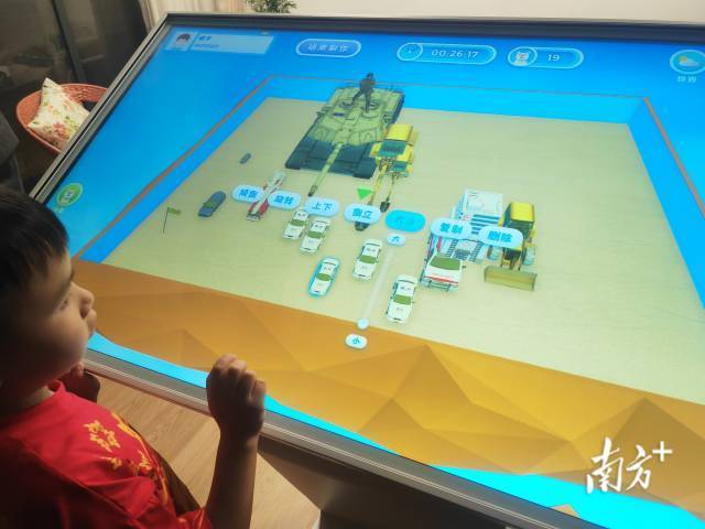 在南海和解中心,一个孩子在“AI心世界”工作室摆放的电子沙盘。