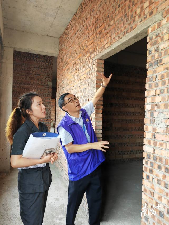 在一起农村自建房引发的工程款纠纷中,法官吕冬娥和建筑领域专家谭工在施工现场察看。