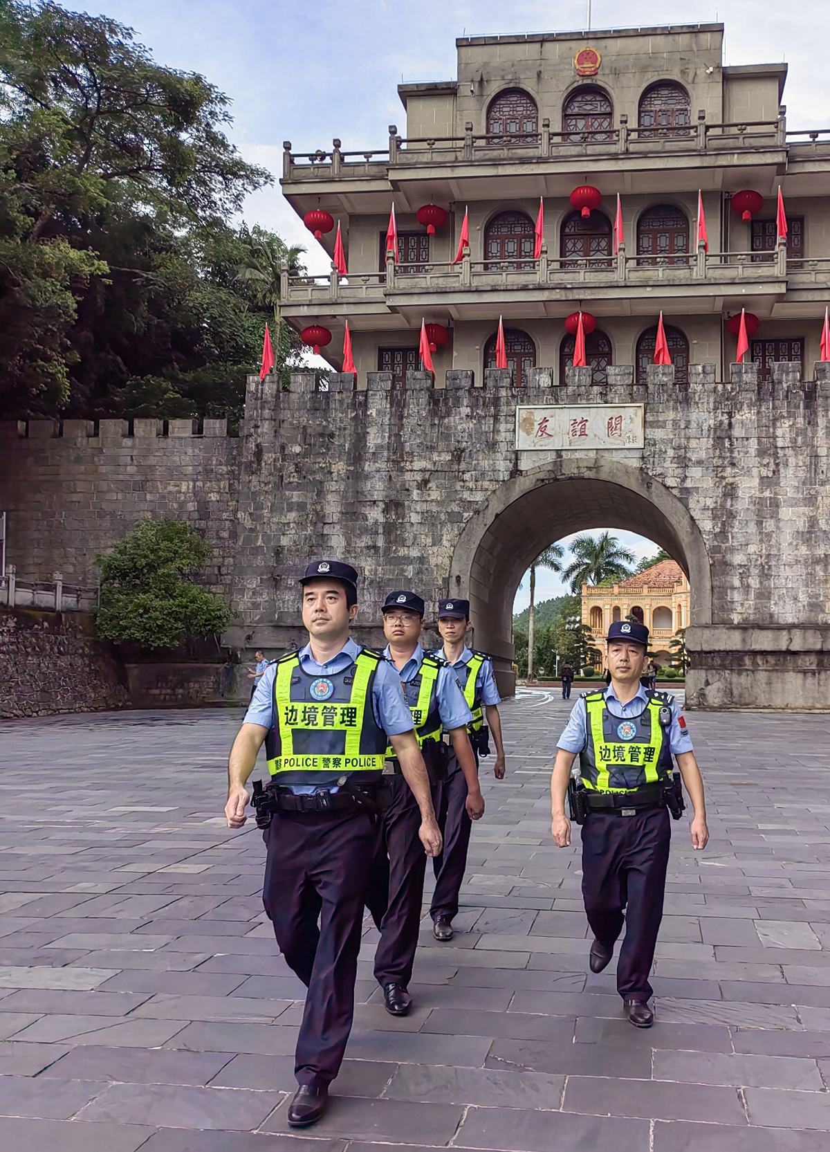 国之盛世,吾之担当。国庆中秋双节期间,崇左边境管理支队全警动员、全力以赴,从严从细落实各项安保措施,为群众欢度佳节筑牢安全屏障。图为10月8日,崇左边境管理支队友谊关边境派出所民警在友谊关景区开展徒步巡逻。