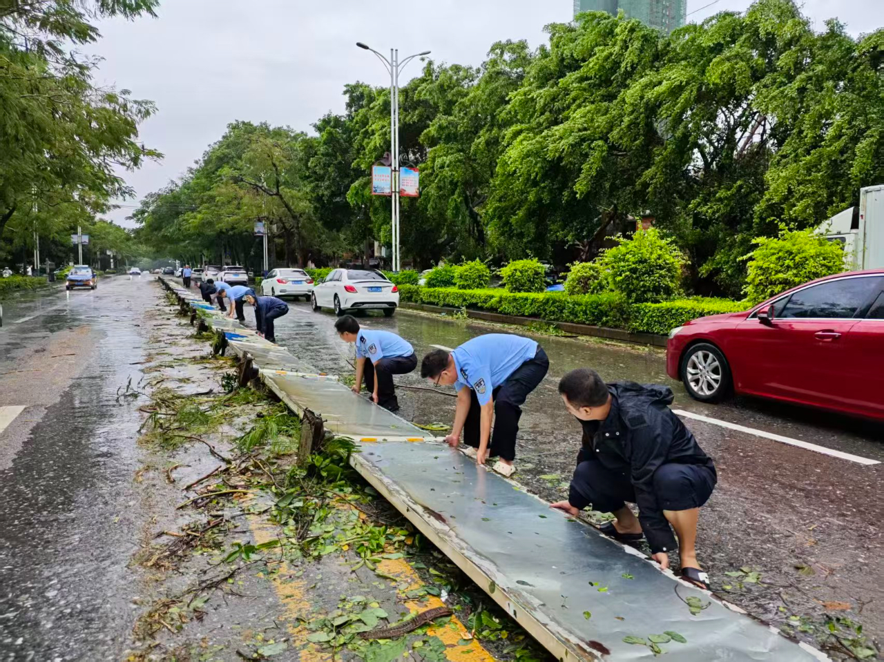 台风过境后,北海市公安局交通管理支队迅速调整工作重心,组建多支清障队伍,兵分多路开展道路清障与交通秩序恢复工作。图为10月6日上午,民辅警对被台风刮倒的交通设施进行扶正。