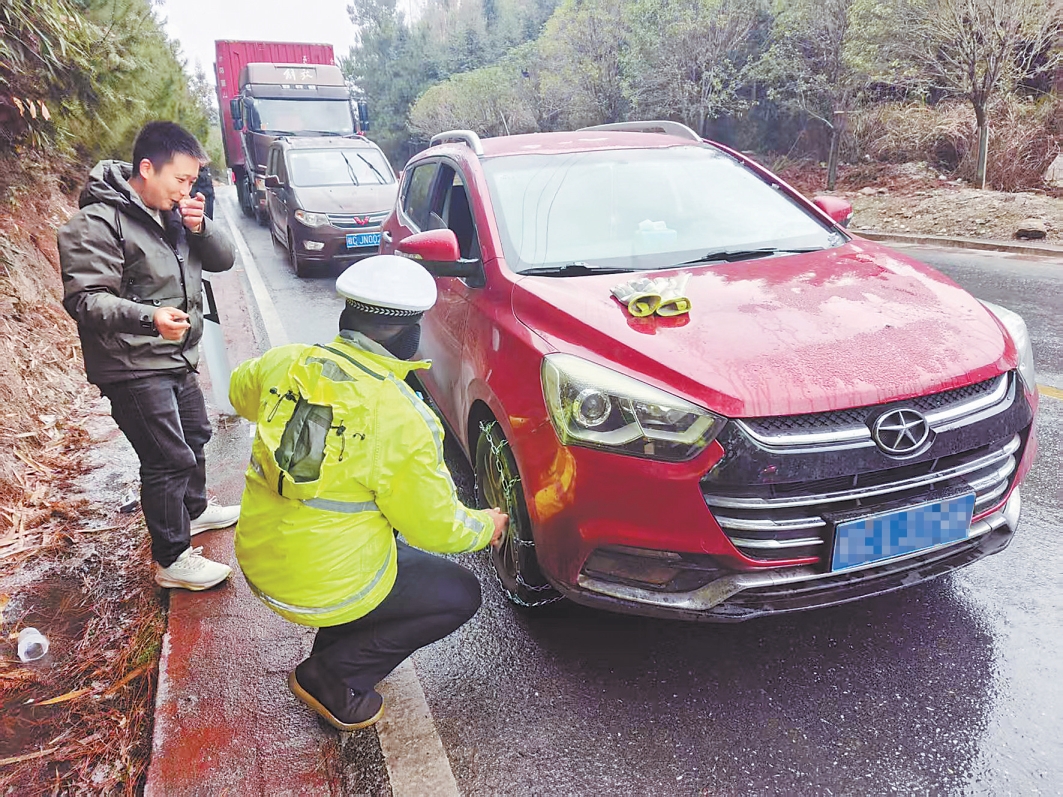 1月21日清晨,全州县域内501省道东山段、301省道才湾天湖段、241国道咸水洛江段一夜冰封。全州县公安局交管大队迅速启动“冰雪警务”应急预案,联合派出所、公路养护中心等多方力量,顶风冒雪、分点作战。在多个执勤点,民辅警为滞留司乘人员提供热水、食物等物资;在景区路段,主动帮助游客车辆安装防滑链;同时利用新媒体平台及时发布路况信息和交通安全提示,加强交通疏导,全力以赴保障道路交通安全。
