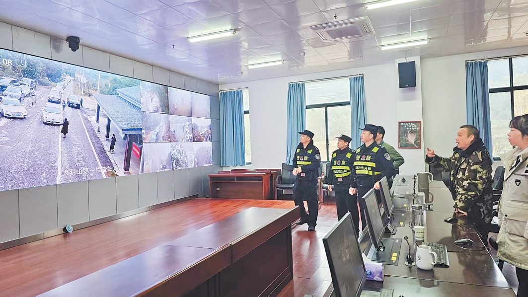 南宁市公安局两江派出所民警通过视频查看大明山景区人流车流情况。