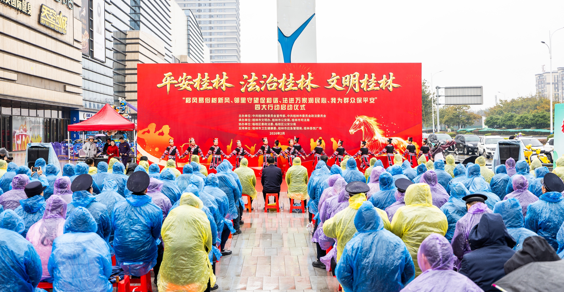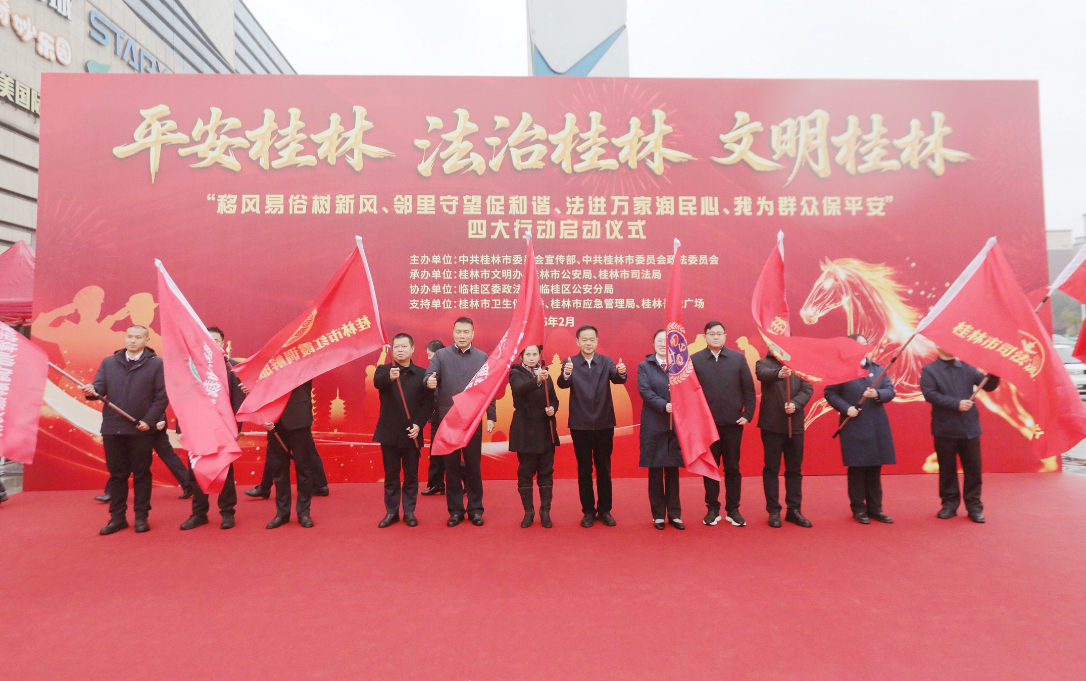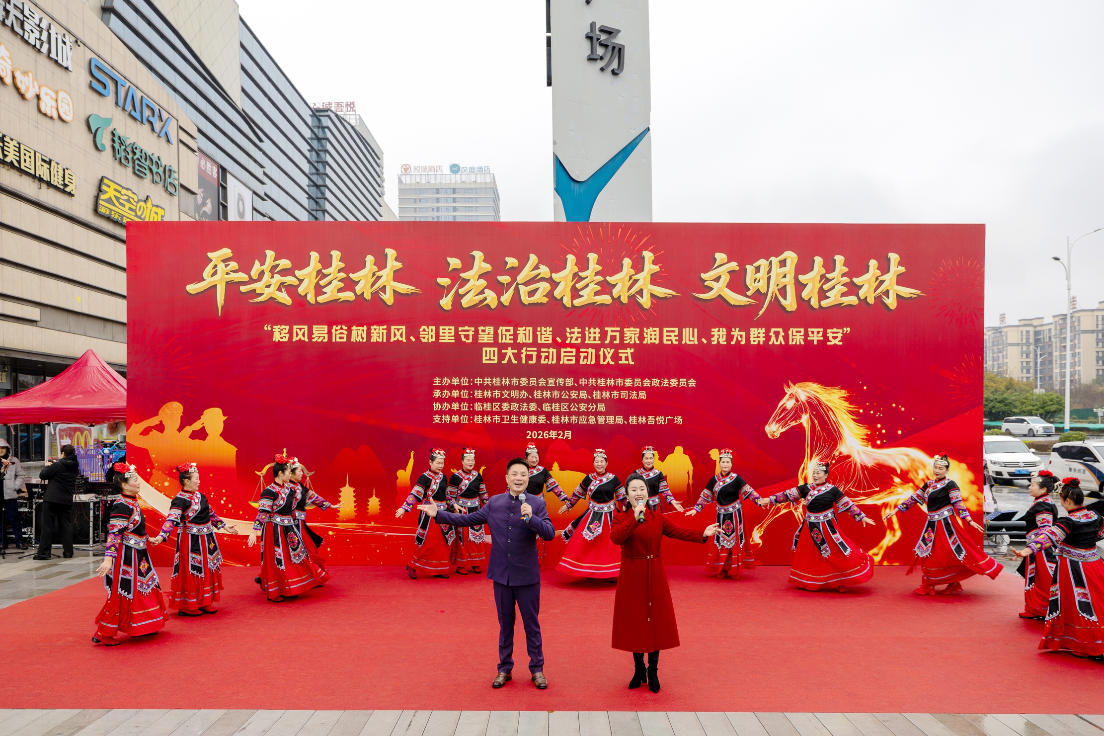 初春的桂北大地,乍暖还寒。广西壮族自治区桂林市临桂区吾悦广场却暖意涌动、人头攒动。2月10日,一场以“平安桂林 法治桂林 文明桂林”为主题的新春系列行动启动仪式在这里热烈且隆重地启幕。