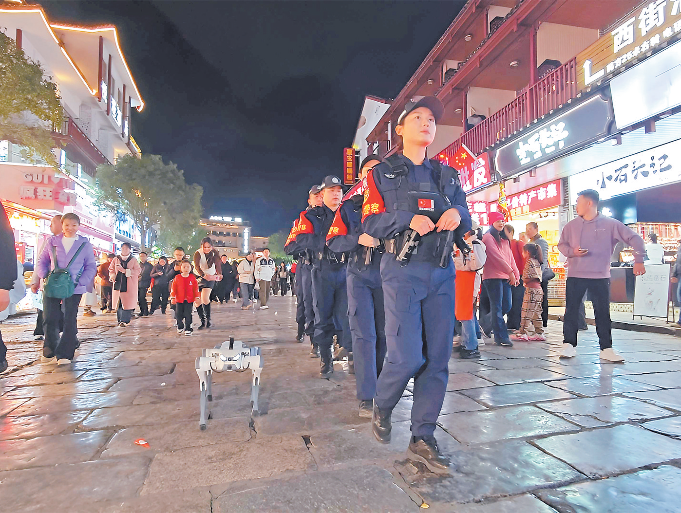 “第一次见机器狗巡逻,感觉很新鲜,也很有安全感,这正是科技改变生活的体现。”春节假期,在桂林阳朔西街游玩的广东游客陈女士说道。人群中,一只身形灵巧、步履稳健的警用机器狗正在穿梭巡逻,吸引游客驻足拍照。这是阳朔县公安局最新投入实战应用的“机器警犬”首次亮相桂林公安春节安保一线,以科技之翼为平安春节赋能的生动场景。