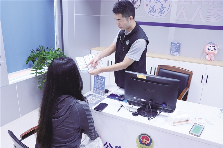 反诈民警罗伟为来访群众解答涉诈问题并普及反诈知识。记者许光伟摄