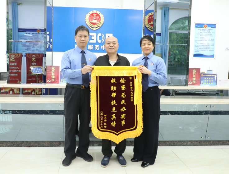 廖梦等检察官为了帮助他解决生活上的困难,多方沟通联络,想方设法解决了他的生活问题,让他特别感动。他真的没有想到,一个身处异地的打工者,在他乡遇到困境时,白沙检察院伸出援手,既能为他维权,还能解决他的生活所困。所以,为表谢意,他特意写了一封感谢信,并专门制作了一面锦旗,专程送到白沙检察院。(宋飞杰)
