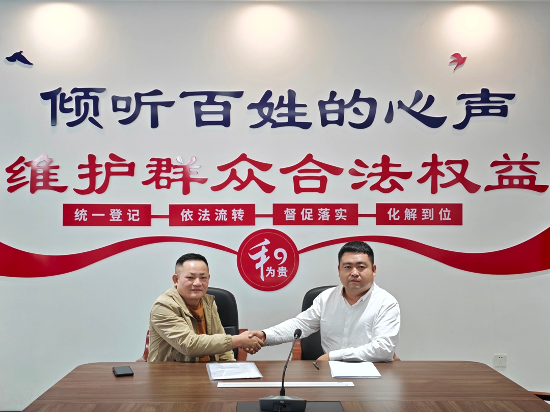 新群村村委会代表与海南德某公司负责人共同签署《调解协议书》后握手言和。(万宁市综治中心供图)