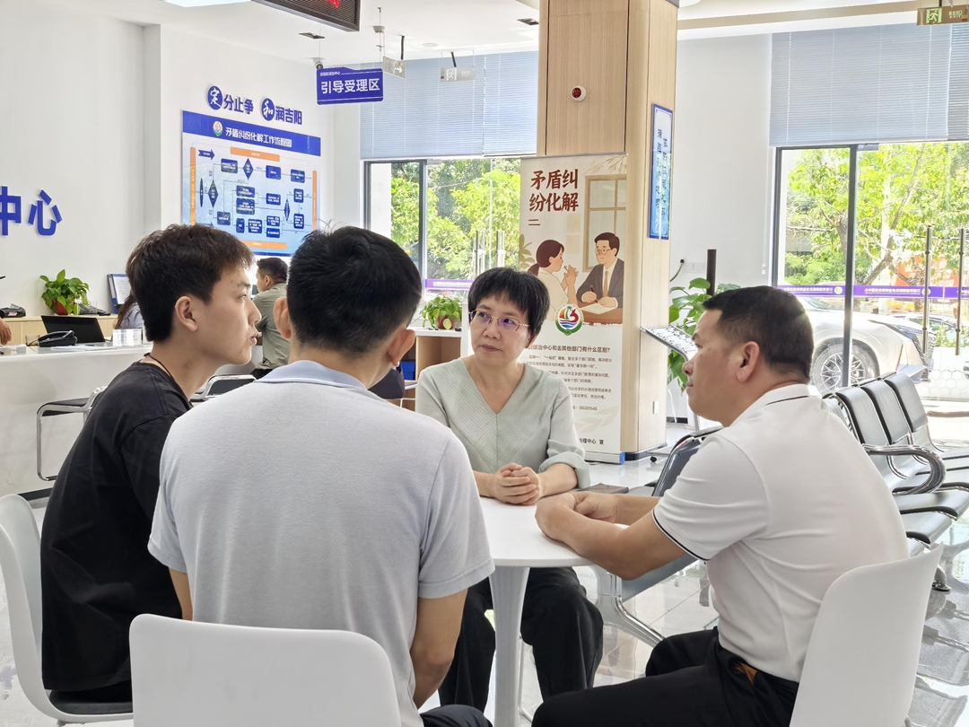 图为三亚市吉阳区综治中心工作人员对矛盾双方进行调解。