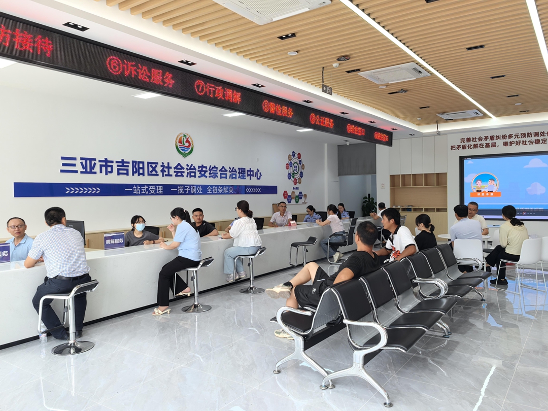 今年6月30日,吉阳区综治中心正式揭牌运行。吉阳区委政法委按照省、市的指引和要求,选址新建区综治中心,面积660平方米,连通吉阳区人社局就业驿站和市综合行政执法局吉阳分局劳动监察部门,形成1千平方米的“解纷终点站”。