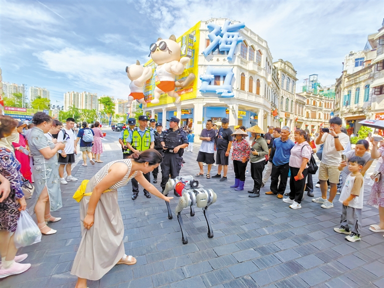 公安民警带着警用机器狗在海口骑楼老街巡逻。(省公安厅供图)