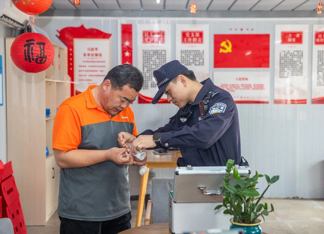 在海口新海港“司机之家”,民警王庆斌帮司机于师傅消毒、包扎受伤的手指。记者符传问 摄
