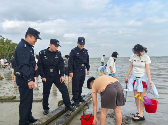 说话间,一名游客小跑过来询问。她手里提着赶海装备,脸上满是笑意:“警官,请问下一波低潮是什么时候呀?”史明祥掏出手机打开潮汐预报,耐心解释:“现在离下一波低潮还有将近2小时,记得别往红树林那边走,那边是保护区。”