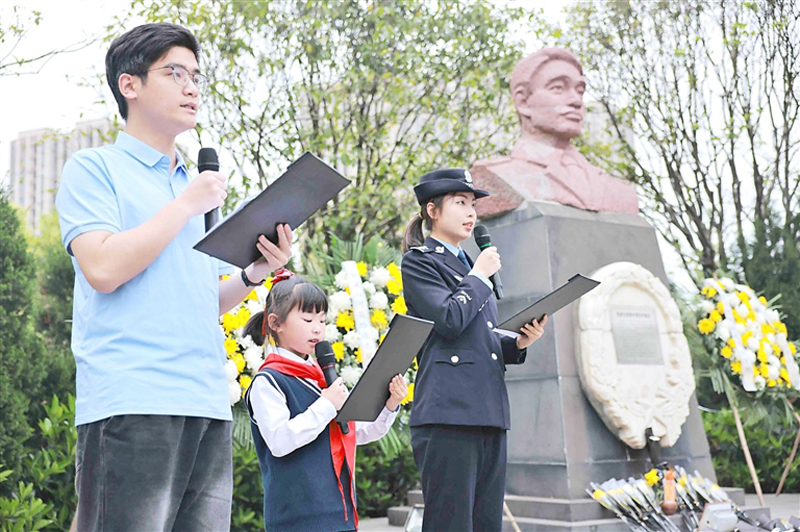 “今天,我们站在你的塑像前——藏蓝的警服,法治的信仰,红领巾的纯真。你未走完的路,我们正接力前行。”芦振龙烈士塑像前,青年民警与学子一同朗诵《致芦振龙烈士——清明祭·忠诚颂》。