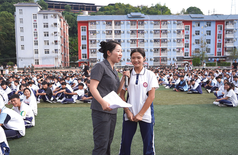 图为从江县人民法院干警走进该县第五中学,开展“情景剧+模拟法庭”普法宣传活动。图为干警与学生互动。
