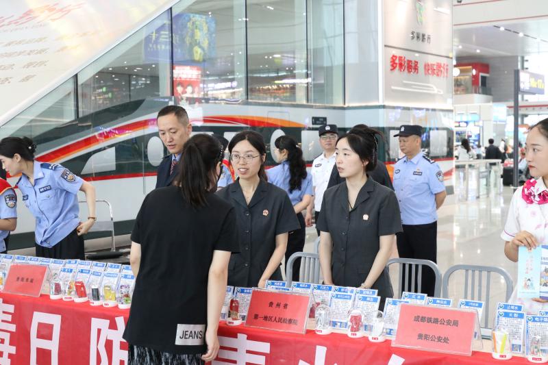 在人来人往的贵阳北站,该院两度开展集中宣传,将禁毒宣传与防范非法金融活动有机结合。干警们身披法治宣传绶带,向过往旅客发放宣传资料,用通俗语言揭露毒品危害与非法金融诈骗陷阱;针对老年旅客、务工人员等重点群体,耐心讲解电信诈骗、养老诈骗防范技巧,手把手指导识别骗局,为群众出行安全与财产安全筑牢“防护网”。