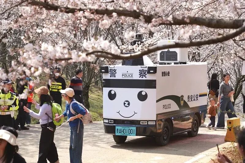 图说贵安新区公安局“智警小安”在樱花园巡逻。