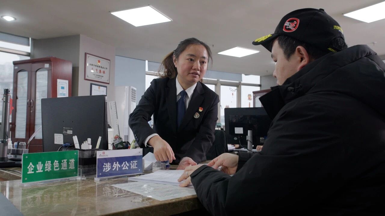 图为涉外公证处工作人员向办事人员讲解相关政策