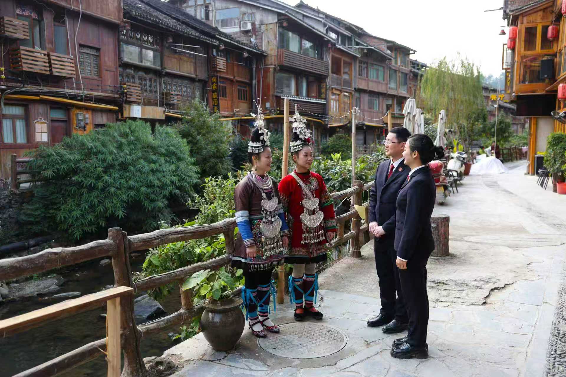 肇兴侗寨风雨桥边,贵州省黎平县检察院检察官正向侗族大歌传承人了解非遗传承情况。