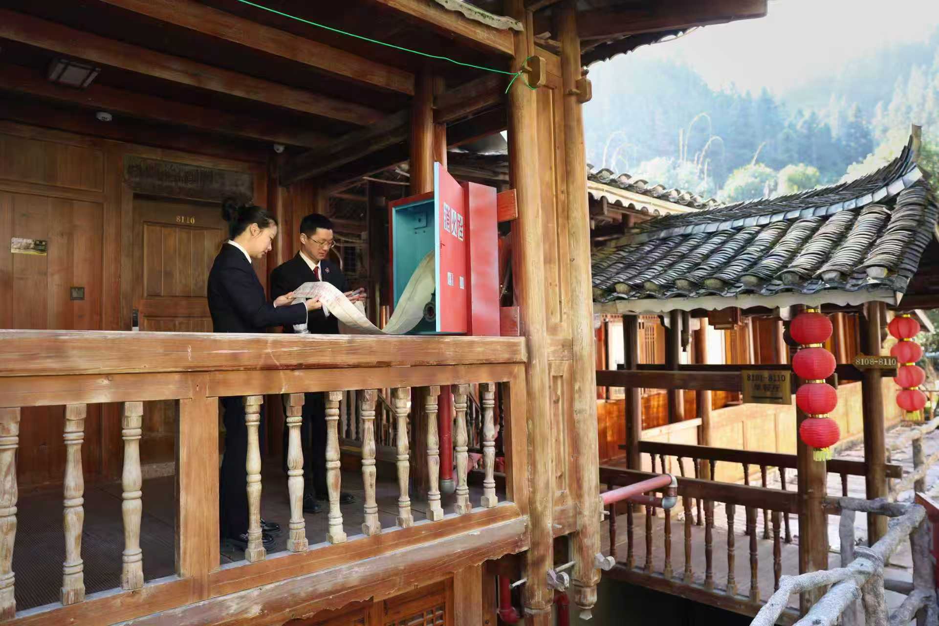 贵州省黎平县检察院检察官来到肇兴侗寨附近民宿了解消防设施设置情况。