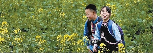 李昌颖(左)与汪政怡(右)上学路上路过一片油菜花田。