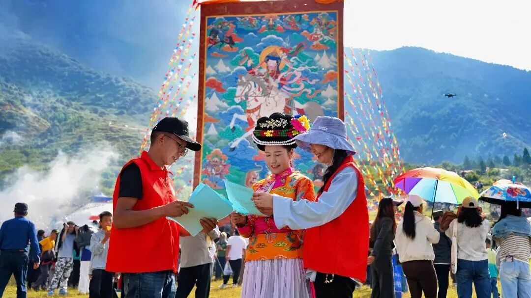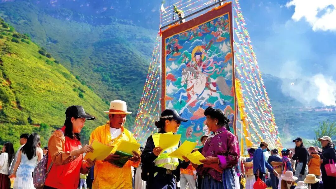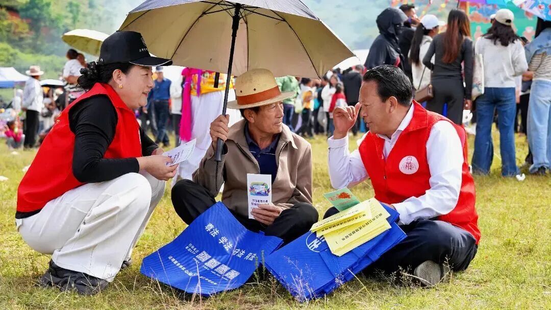 在永宁镇者波村,达巴执礼祈福,格姆女神画像庄严悬挂,节奏欢快、充满活力的甲搓舞,以其独特的民族魅力吸引着无数游客驻足观赏并参与其中。宁蒗县“毛建忠双语普法工作队”通过设置法律咨询台、发放双语宣传手册、现场解答法律问题等实干举措,将法治服务巧妙融入民俗场景中,用最“接地气”的方式把法律知识送到群众身边。