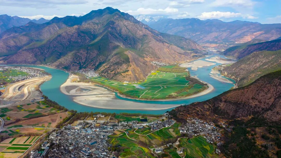 长江从青藏高原奔流而下,与澜沧江、怒江并肩在横断山脉中穿行,到玉龙纳西族自治县石鼓镇时突然转向,形成罕见的“V”字形河道,这便是“长江第一湾”。