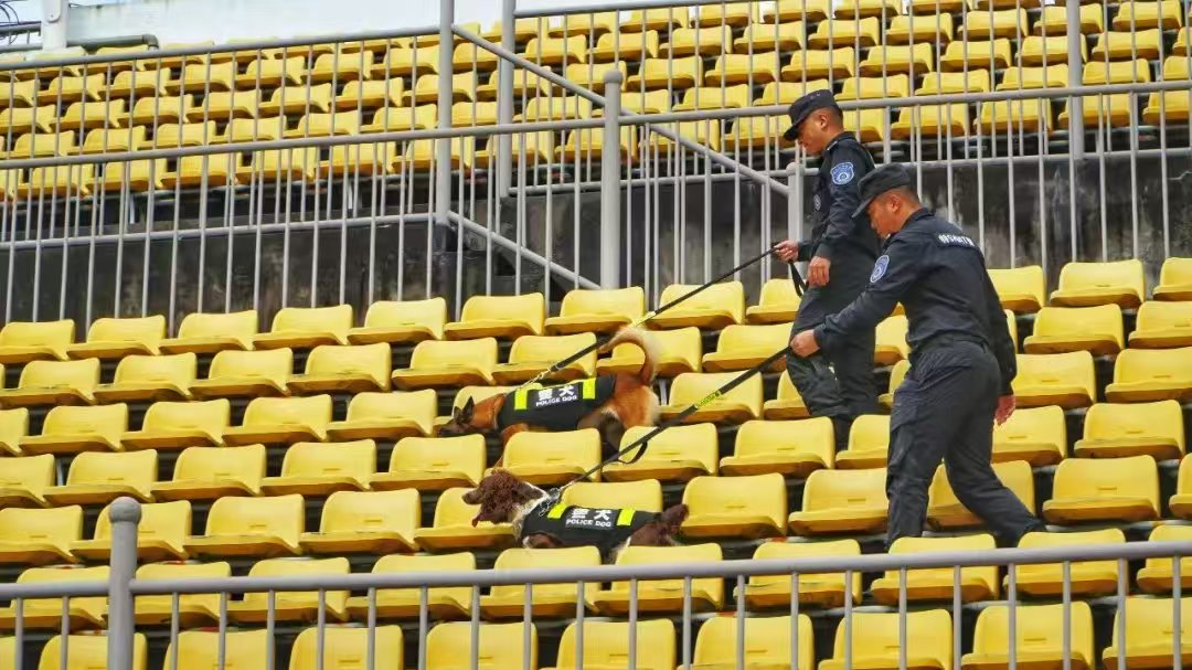 赛前数小时,观众还未入场,“汪汪队”已全员到岗,化身“无声的安检专家”。鼻尖紧贴地面轻嗅,耳朵警惕竖起,四肢稳健迈步,每一个动作都精准利落,在训导员的带领下对玉溪、大理、昭通等八个主场赛区的体育场入口、看台区、球员通道等关键区域开展地毯式排查。成为人工安检和设备检测的“最强辅助”,用专业守护赛场零隐患。
