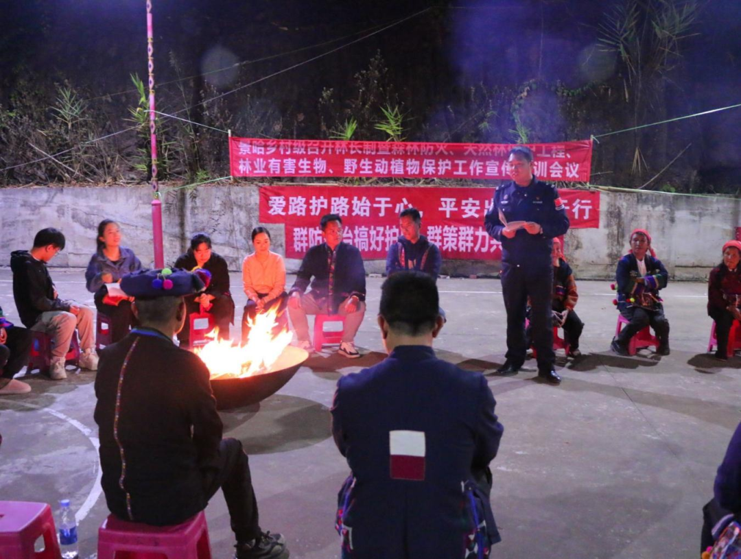 在哈尼族文化中,火塘是村寨的灵魂所在,是邻里相聚、闲话家常、传承文脉的核心场所,承载着各族群众守望相助的温情。而穿梭在景哈乡的铁路,既是衔接内外物资流通、带动区域发展的“经济主动脉”,更是守护边疆稳定、保障群众安居乐业的“安全防护线”,与哈尼族群众的生产生活息息相关。活动现场,熊熊火塘暖意融融,普法志愿者与哈尼族群众围坐一圈,卸下距离感,用亲切的本土方言拉家常、话安全,将铁路安全知识、法治理念融入闲聊之中,摒弃生硬说教,让原本严肃的普法宣传变得温润可亲,让群众在潜移默化中理解铁路安全的重要意义。