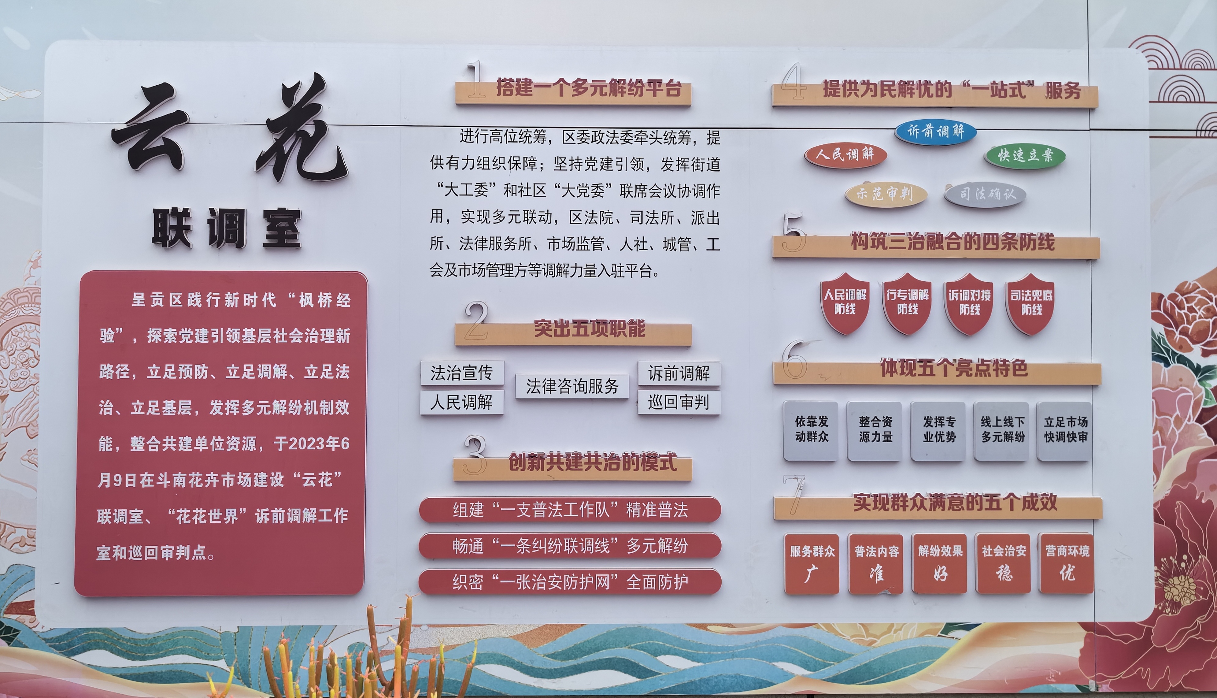 如今,“花花世界”调解室、巡回审判点已从2022年设立伊始的一花独放,发展到斗南街道人民调解委员会“云花”联调室、呈贡区总工会“云花”劳动争议多元化解工作站与联合调解中心、斗南花卉新就业形态劳动纠纷一站式调解中心等解纷“朋友圈”的百花争艳,“市场自治+行业调解+司法保障”共治模式让多元解纷不断迭代升级。
