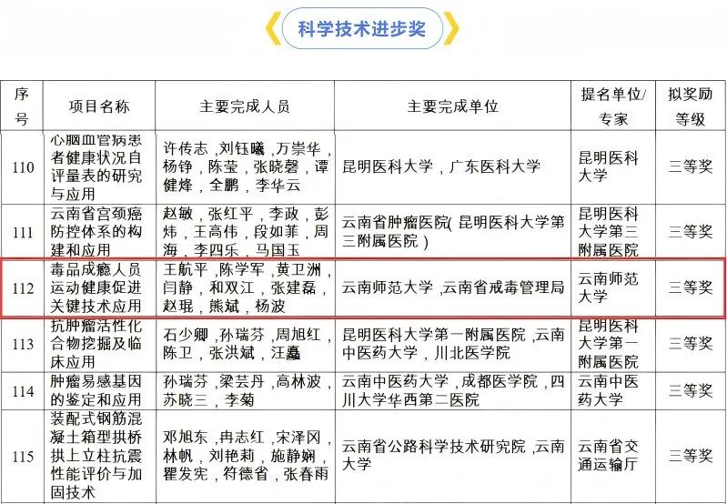 近日,云南省科学技术奖励委员会审定并公示了2025年度云南省科学技术奖评审结果。其中由云南师范大学和云南省戒毒管理局作为主要完成单位、省第五强制隔离戒毒所具体参与申报的“毒品成瘾人员运动健康促进关键技术应用”项目荣获云南省科技进步奖三等奖。