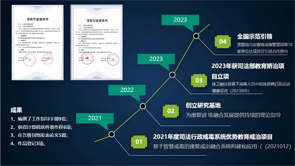 该项目围绕如何提高毒品成瘾人群身心健康水平,降低复吸率的重大现实需求,系统研发了“数据全链采集-智能动态分析-靶向精准干预-全程效果追踪”智慧戒毒评价技术体系,实现毒品成瘾人员智慧化康复管理,数智化运动处方生成与评估,全链条身心功能的科学重建。