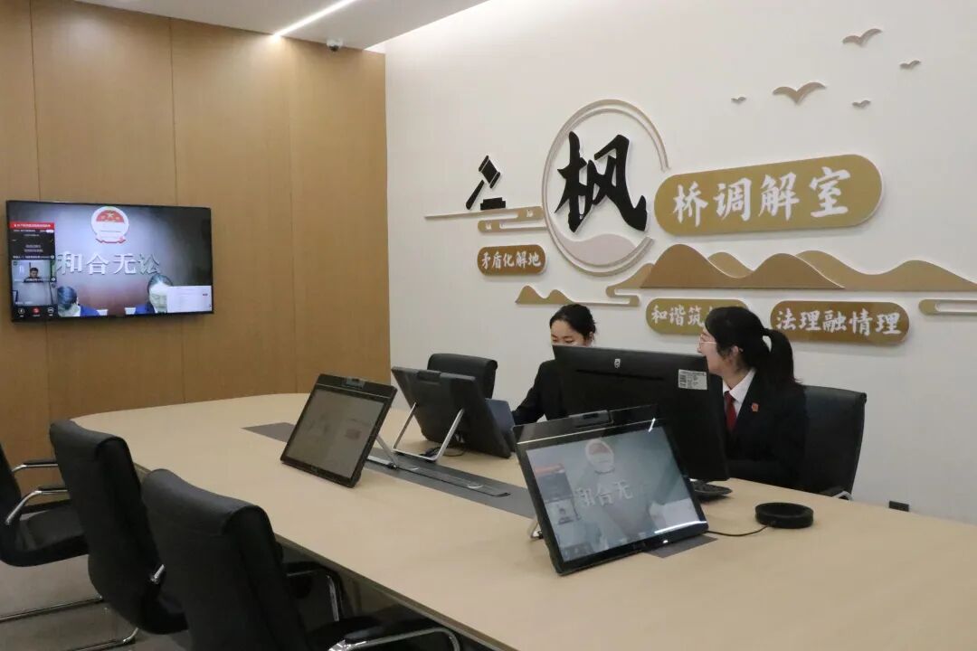 在这里,专业协同高效运转:省工商联“商事调解室”与法庭“互联网调解室”实时连线,形成“线上+线下”联动解纷模式;推行“一平台调解、全流程在线、菜单式服务”机制,提升企业守法意识;未调解成功案件,提供在线自助立案服务,为当事人节约了诉讼资源。